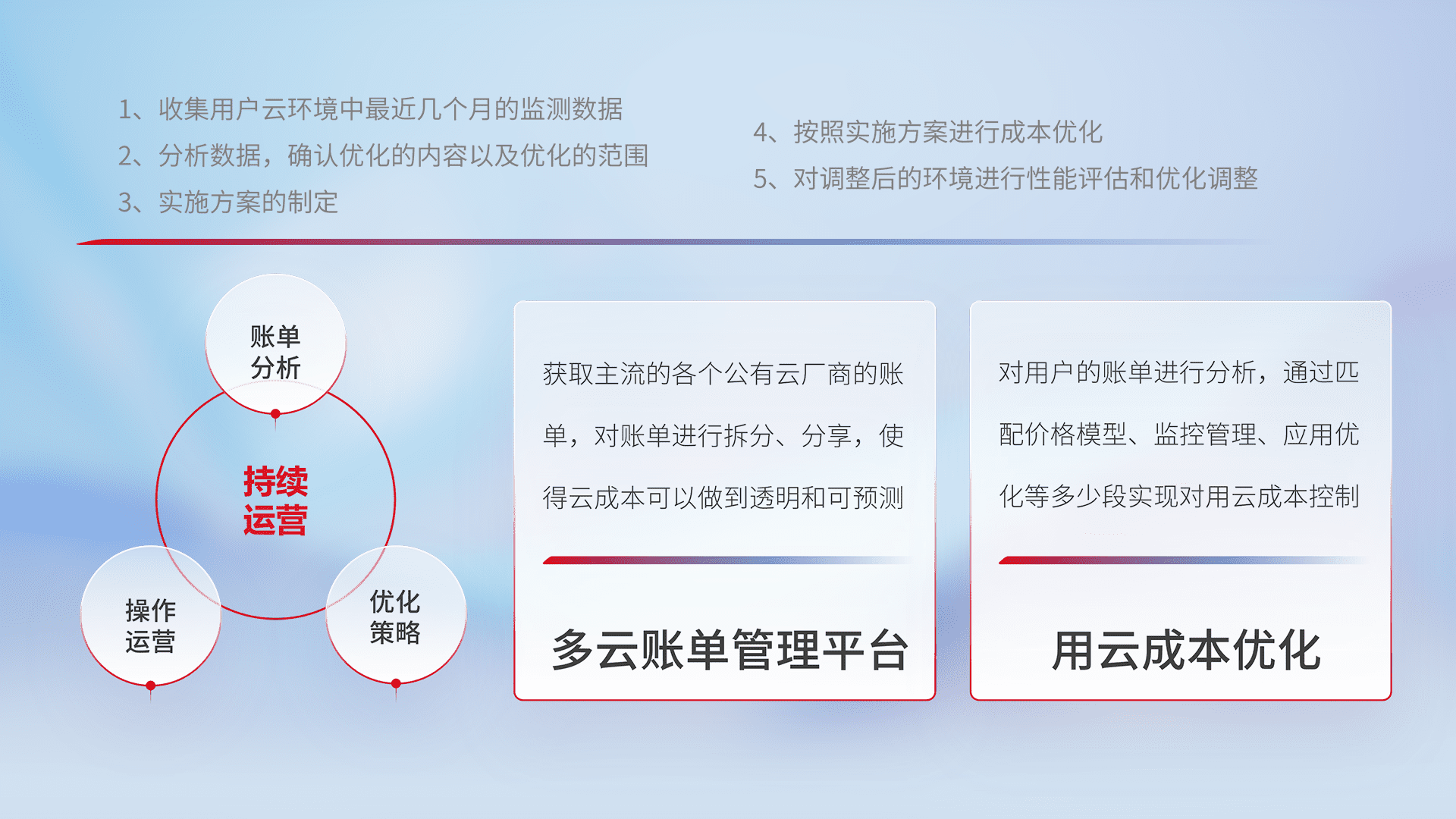通过多云纳管,,以统一的资源数据模型把客户的云资源进行抽象和封装,,,,进而实现对多云资源的统一操作,,保障云资源管理的可靠性、、、、稳定性与可用性。。量身定制化运维内容,,,,配置、、、开发运维、、、补丁管理、、备份、、、监控、、、认证和访问管理、、、审计和日常巡检等,,,,保障在用云过程中的可靠度,,稳定度以及高可用率。。。。